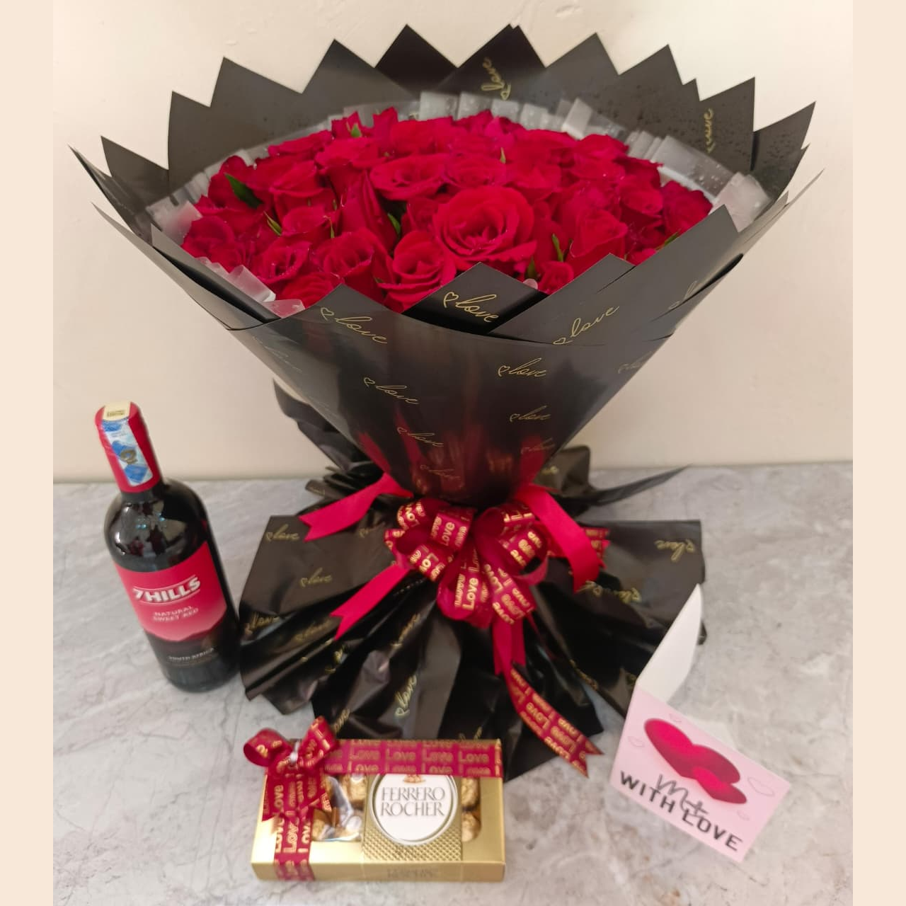 Because 100 roses, fine wine, and chocolates don’t just say I love you — they make it unforgettable.