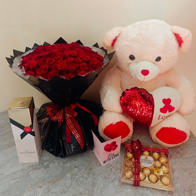 This grand Valentine gift is designed for the kind of love that doesn’t whisper — it shows up boldly. From the sheer volume of deep red roses to the soft comfort of a plush teddy and the indulgence of fine chocolates and champagne, every element in this set is meant to create a pause… then a smile… then a memory that lasts.