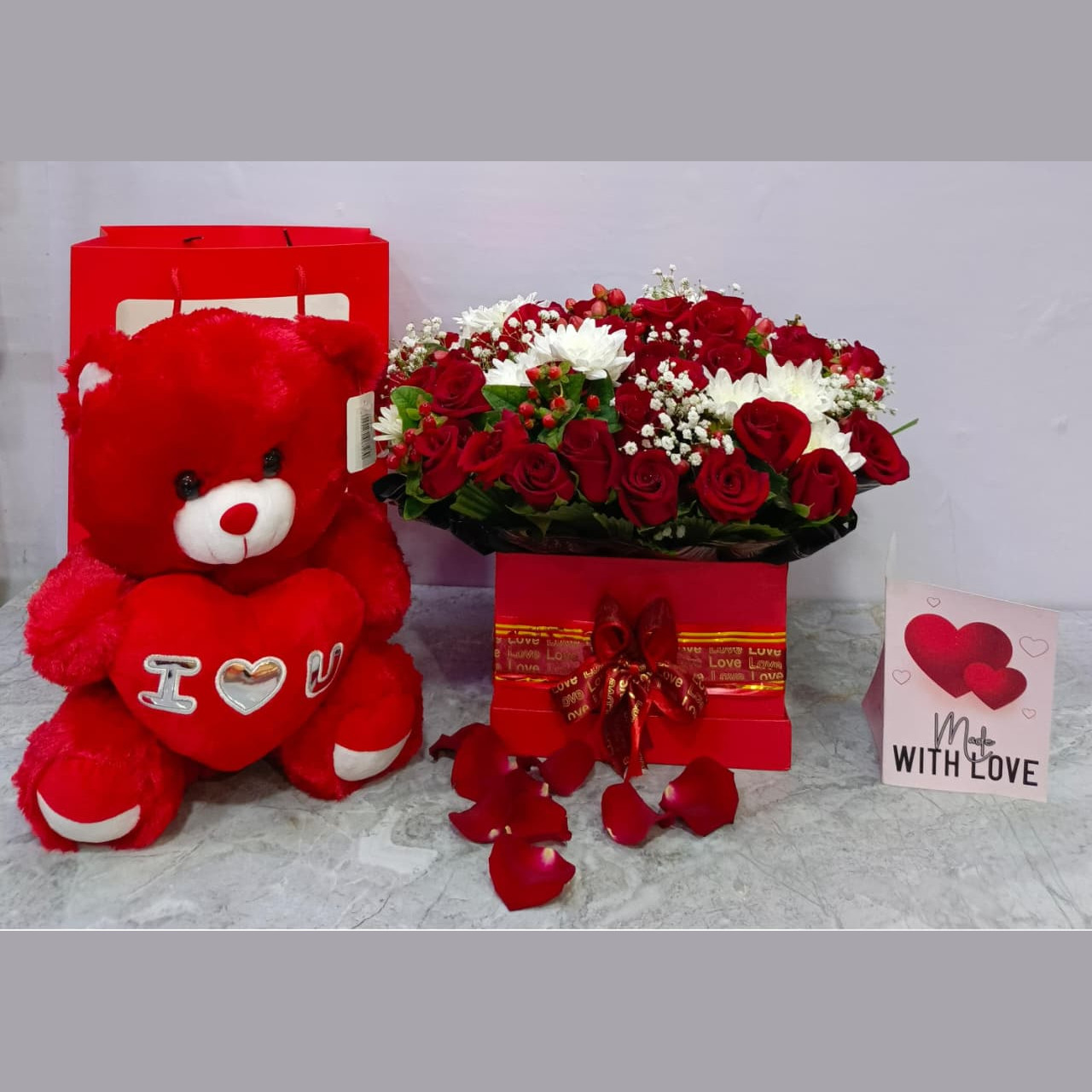 Make a powerful Valentine’s statement with this VIP Love Box, designed for those who love loudly and unapologetically. This striking gift set pairs a lush red rose flower box with elegant white accent blooms and a classic red teddy bear holding a love heart—an irresistible combination of passion and charm.