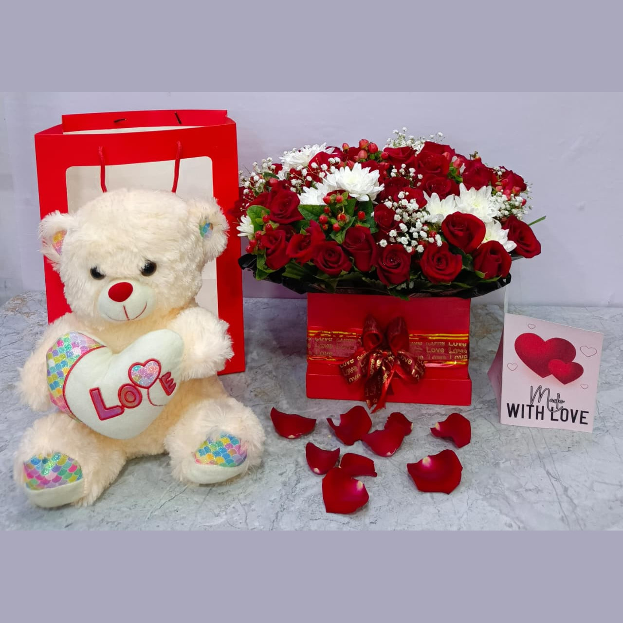 This luxurious set features a stunning red box floral arrangement made with fresh premium roses, beautifully accented with soft white blooms and baby’s breath for balance and elegance. Paired with a cuddly plush teddy holding a heart of love, this package speaks volumes without saying a word.