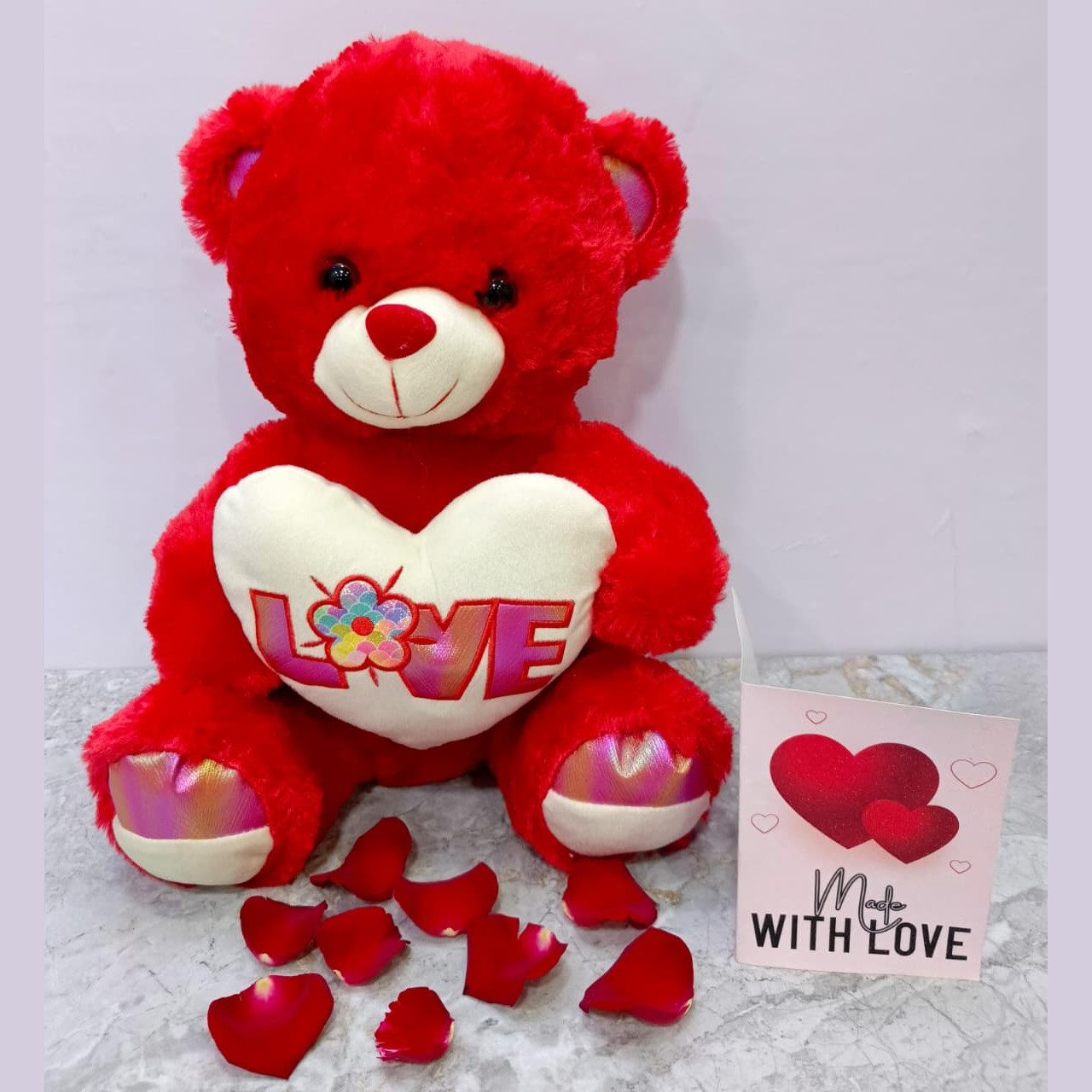 Made with ultra-soft plush fabric, this charming red teddy holds a heart boldly embroidered with “LOVE”, making it an instant symbol of romance and comfort. Finished with delicate Valentine details and paired with a love card, it’s a timeless keepsake your special someone can treasure.