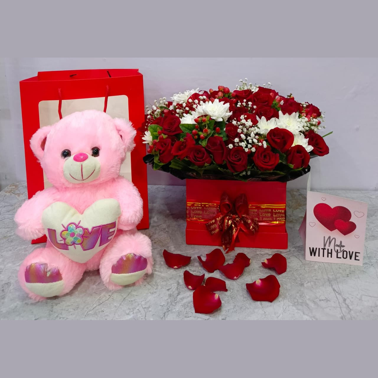 Turn Valentine’s Day into a moment they’ll never forget with this VIP Romance Box, a perfect blend of elegance and affection. This beautifully curated gift pairs a luxurious red rose box arrangement with a soft pink teddy bear, creating a romantic surprise that melts hearts instantly.